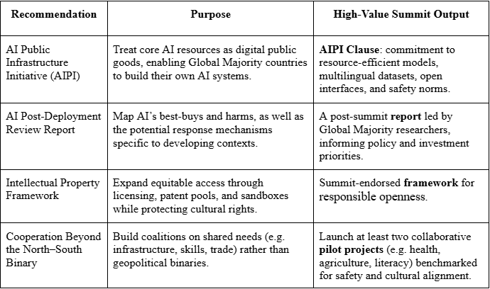 For the Summit, India should include an AIPI clause in the final declaration: a commitment of the signatories to open-weight models, culturally representative datasets, and responsible licensing frameworks. By embedding safety, consent and inclusivity standards from the start, AIPI lowers barriers for Global South innovators while reinforcing global cooperation.