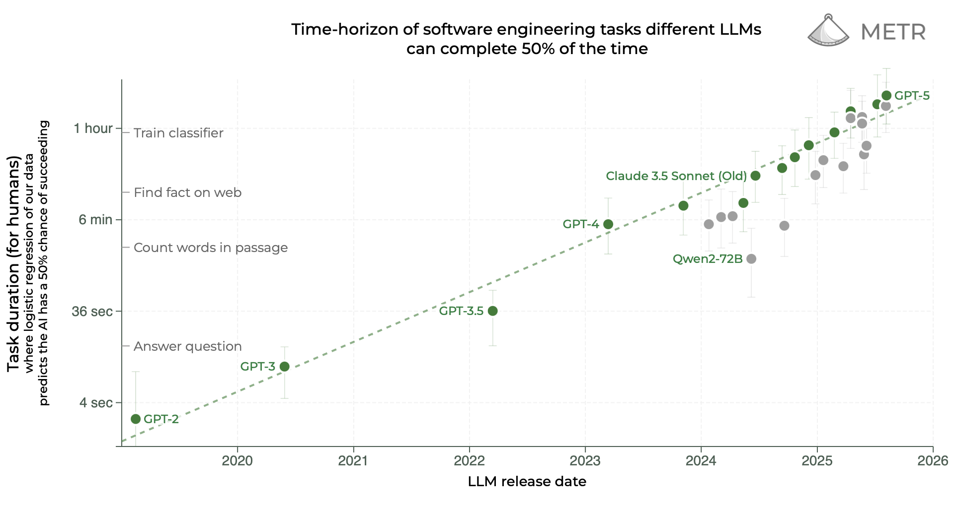 The cutting edge of RL in reasoning is training for longer and longer tasks, as evidenced by METR’s research showing that (for a certain type of research engineering work) the task length that models can succeed on (measured in hours it would have taken a human) has been doubling every 7 months.