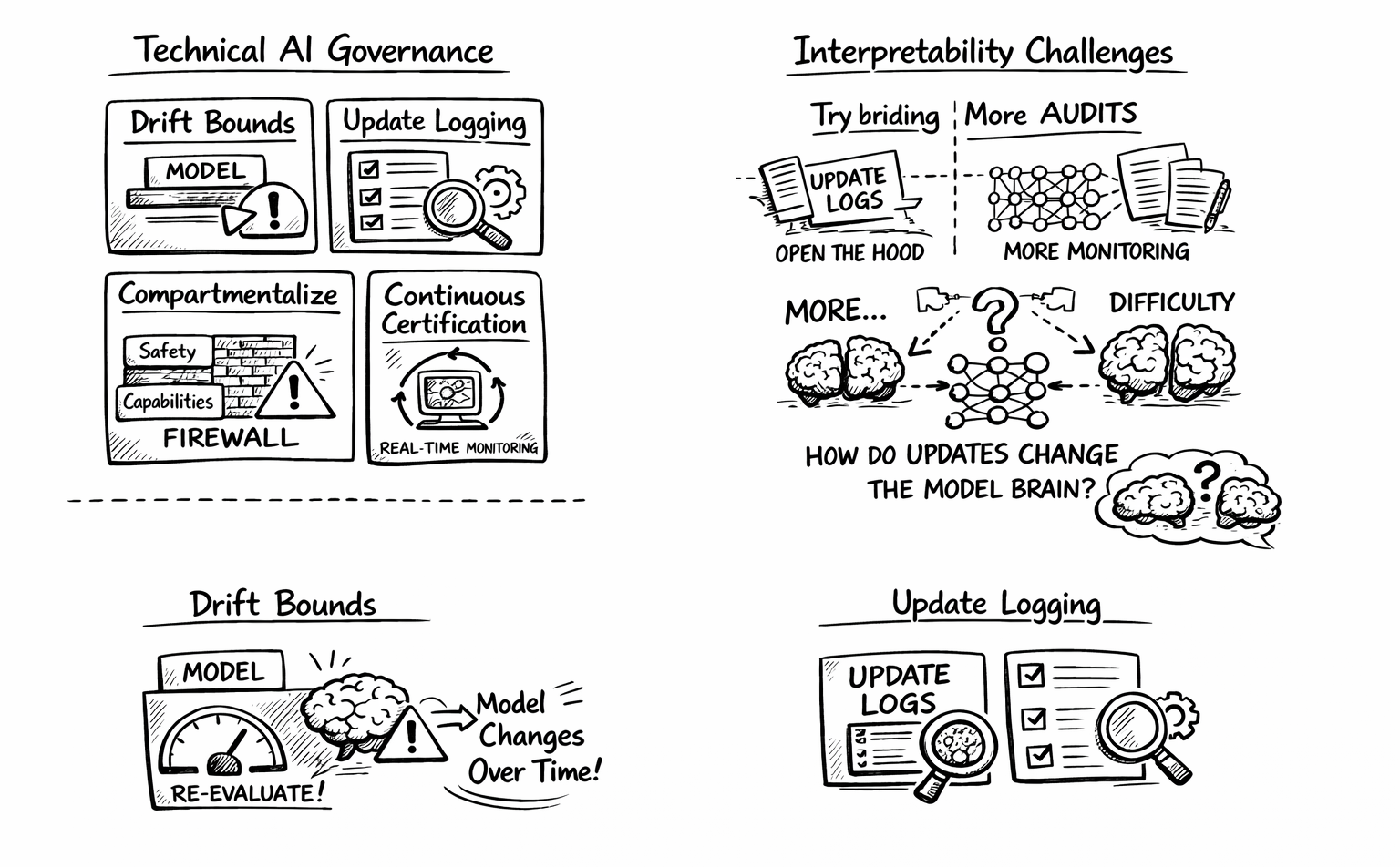 - Drift bounds: Require that deployed models stay within some measurable distance of their evaluated state, with automatic re-evaluation triggers if they drift too far.